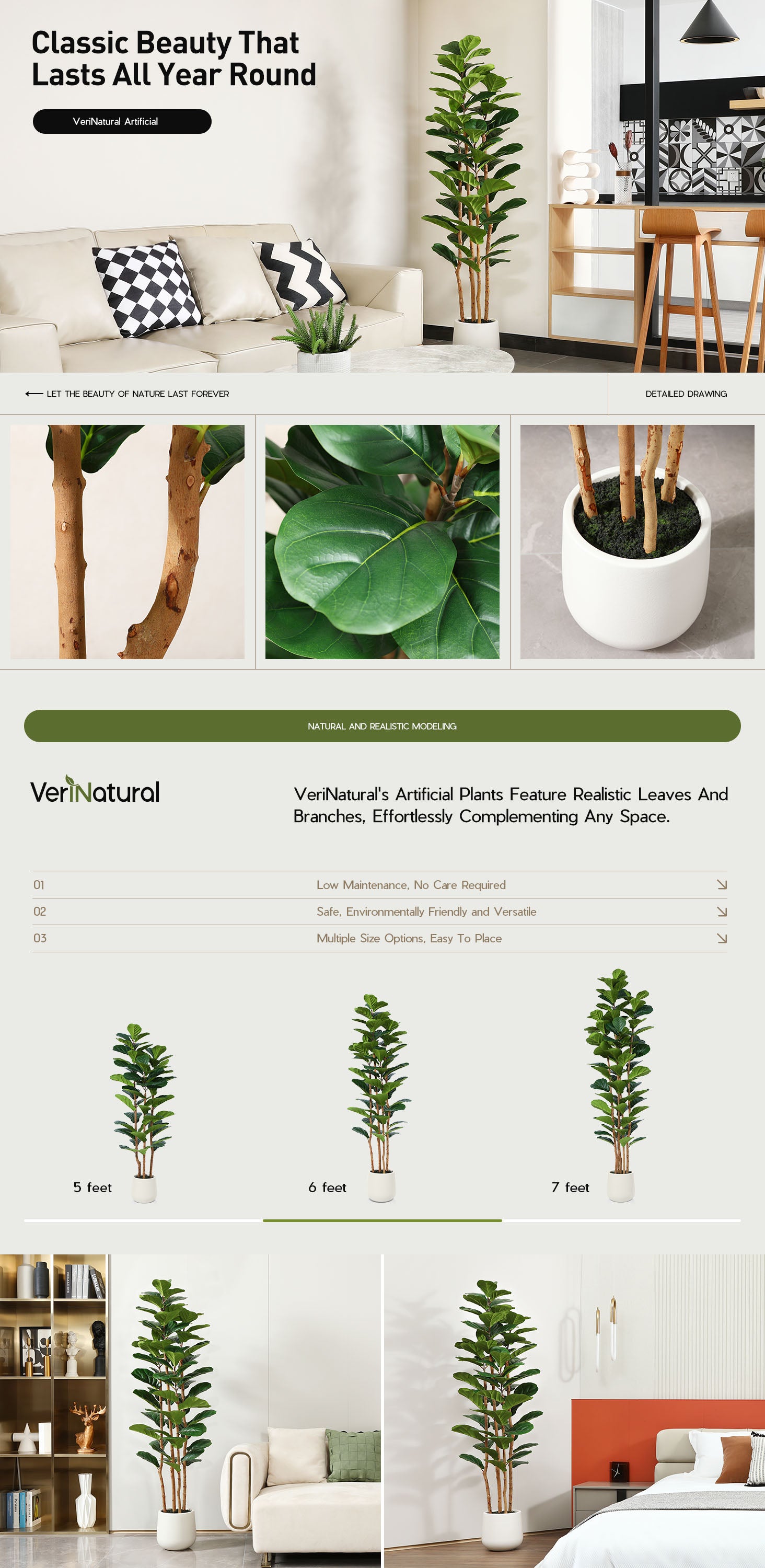 VeriNatural 5/6/7FT Artificial Fiddle-leaf Fig Trees with White Planter for Indoor