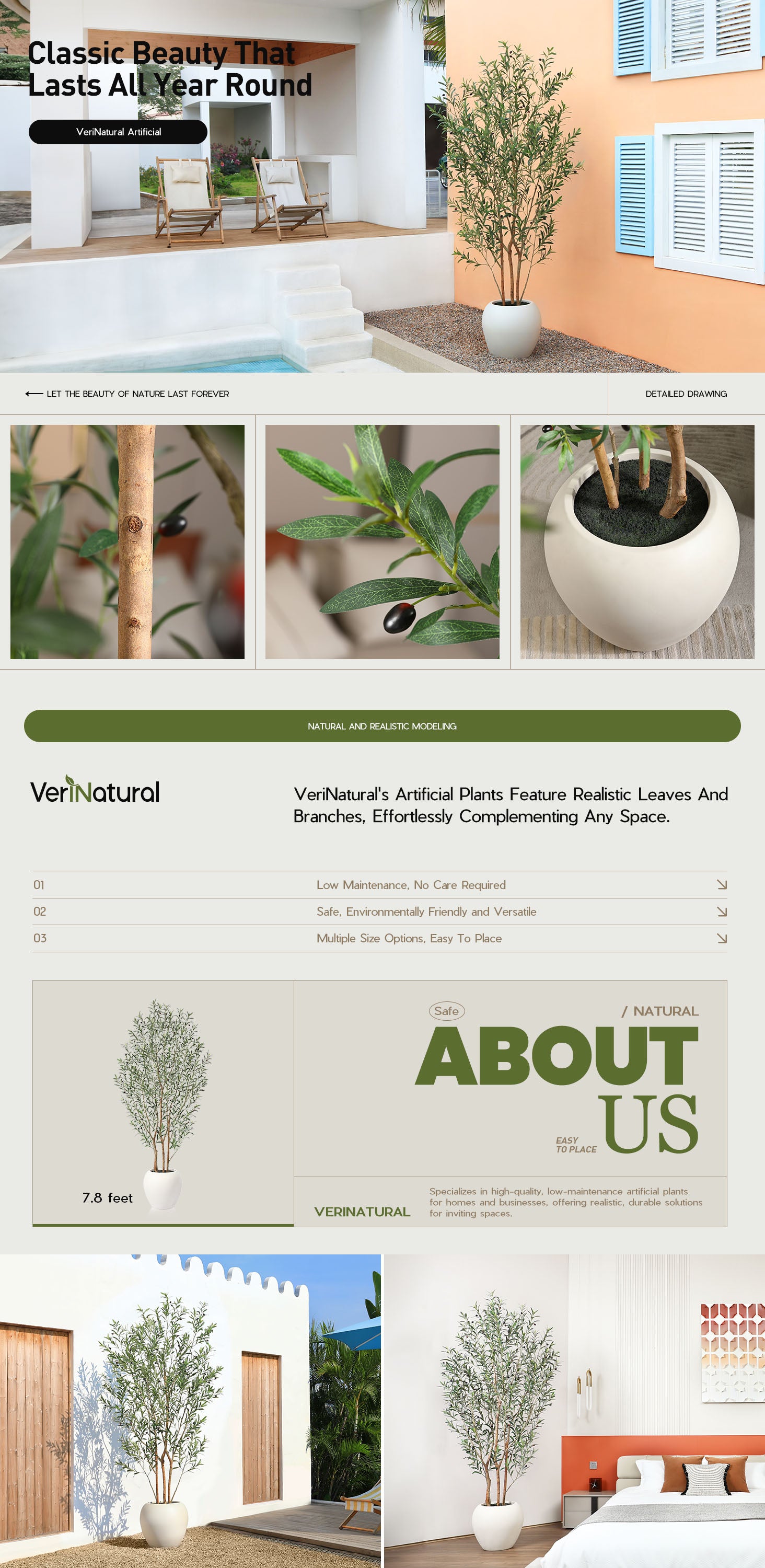Standing a full 7.8FT tall, this faux olive tree brings a stunning vertical element to your home decor. With its thin brown stems and delicate, vibrant green leaves, it’s easy to see why this tree is a favorite among home decorative style enthusiasts and frequently showcased by influencers. This artificial olive tree’s light, airy design is complemented by lifelike faux olives, giving it a rustic yet sophisticated charm that evokes the beauty of the Italian countryside.