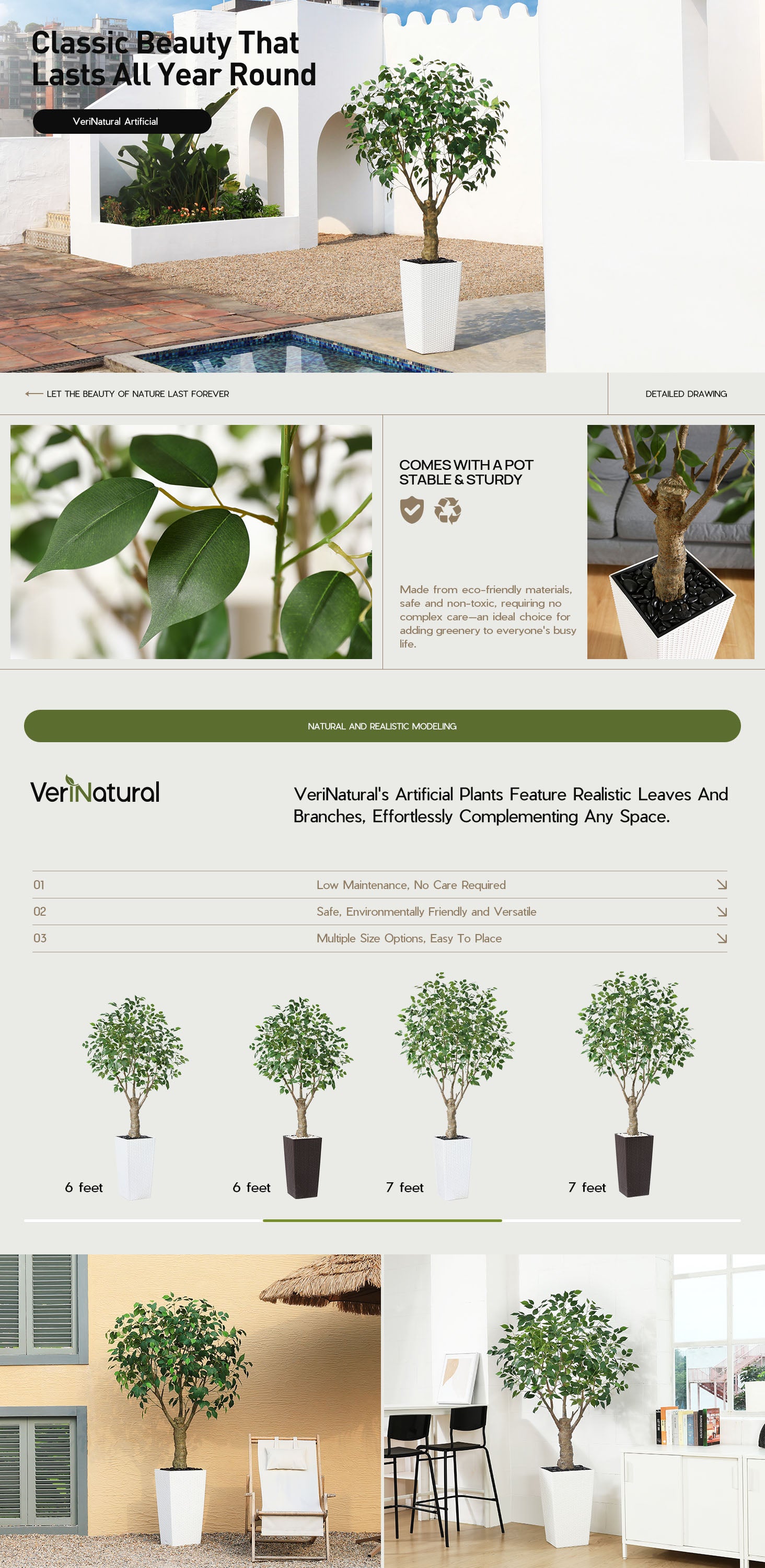 VeriNatural 6/7FT Artificial Ficus Tree with White/Brown Taper Planter for Indoor & Outdoor