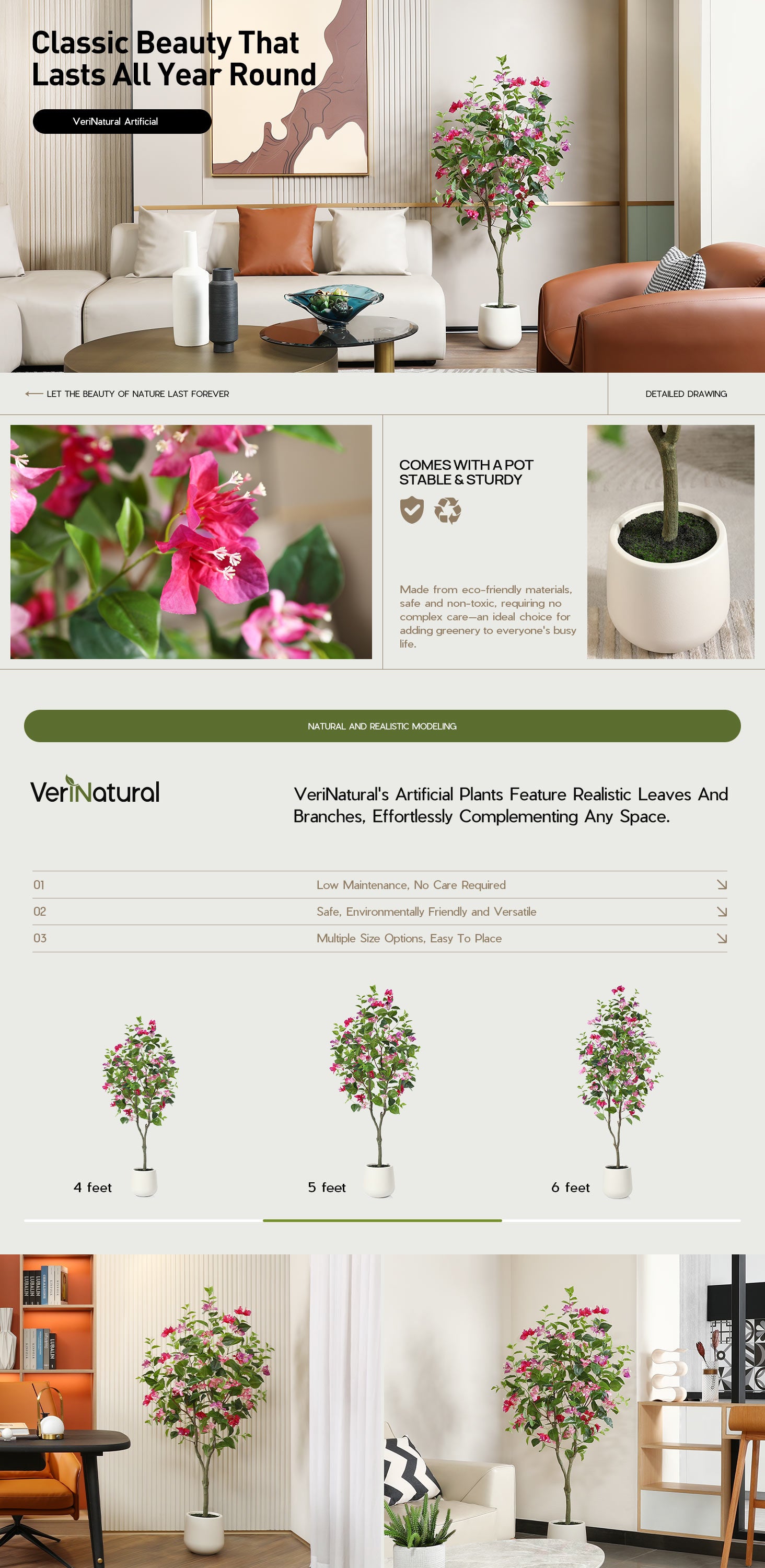 Add a pop of color to your decor with this vibrant Bougainvillea artificial tree, featuring stunning pink flowers that stem from a realistic brown trunk. Inspired by nature, the lush, lifelike flowers bring a refreshing, feminine touch to any room. Standing at 4FT/5FT/6FT tall in a classic nursery planter, this eye-catching faux bougainvillea tree is perfect for adding color and warmth to spaces like bathrooms, home offices, or kitchens. Expertly designed and approved by horticulturists, this maintenance-free tree offers year-round beauty and charm.