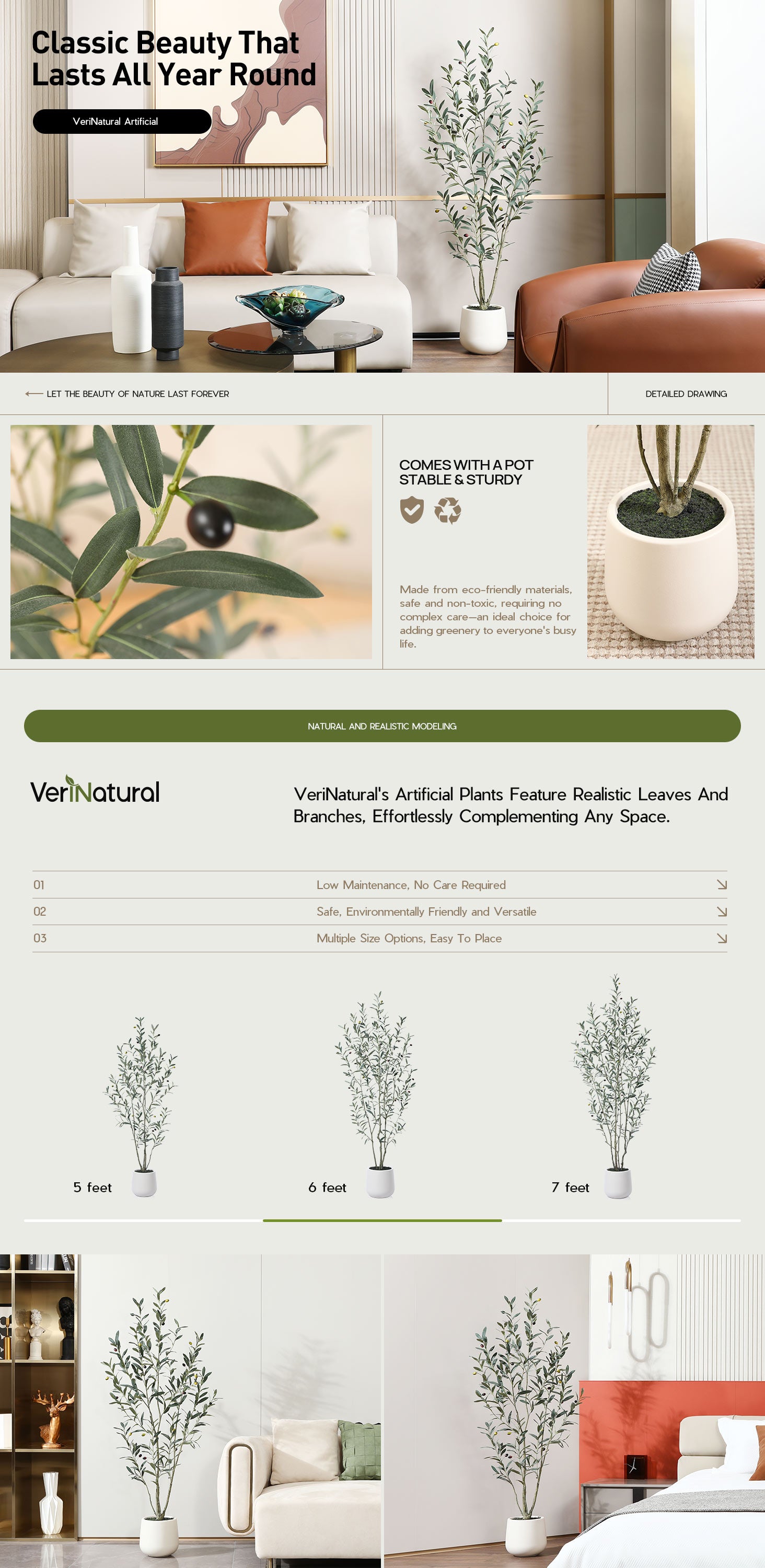 Standing a full 5FT/6FT/7FT tall, this faux olive tree brings a stunning vertical element to your home decor. With its thin brown stems and delicate, vibrant green leaves, it’s easy to see why this tree is a favorite among home decorative style enthusiasts and frequently showcased by influencers. This artificial olive tree’s light, airy design is complemented by lifelike faux olives, giving it a rustic yet sophisticated charm that evokes the beauty of the Italian countryside.