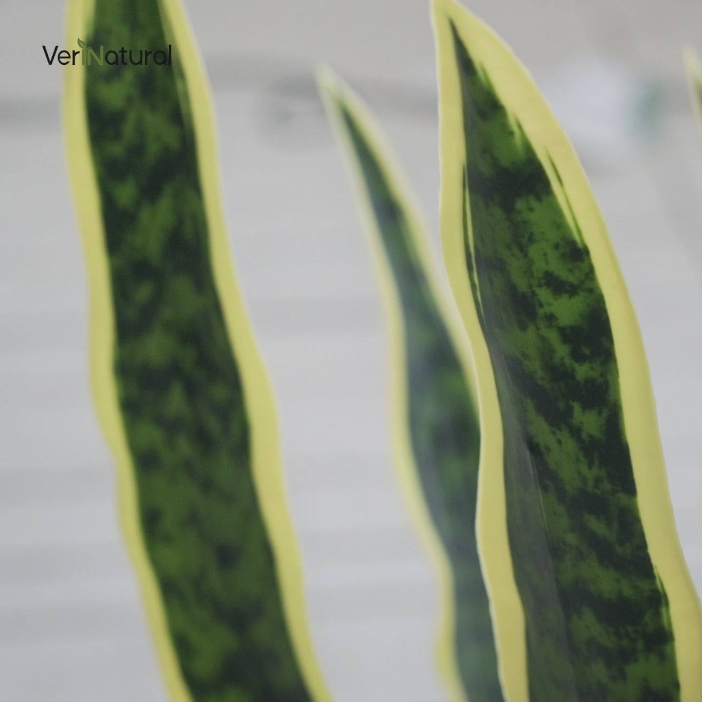 A modern blend of layered greenery and tall, striped snake plant leaves